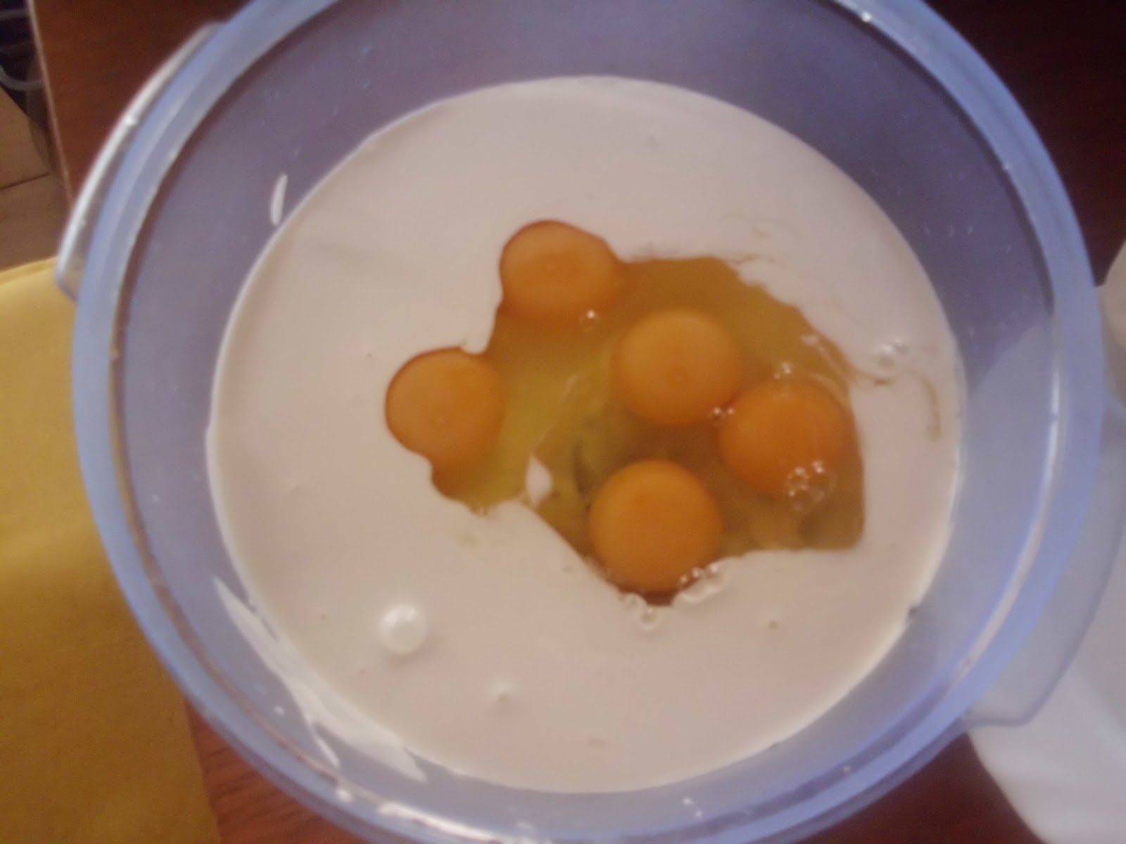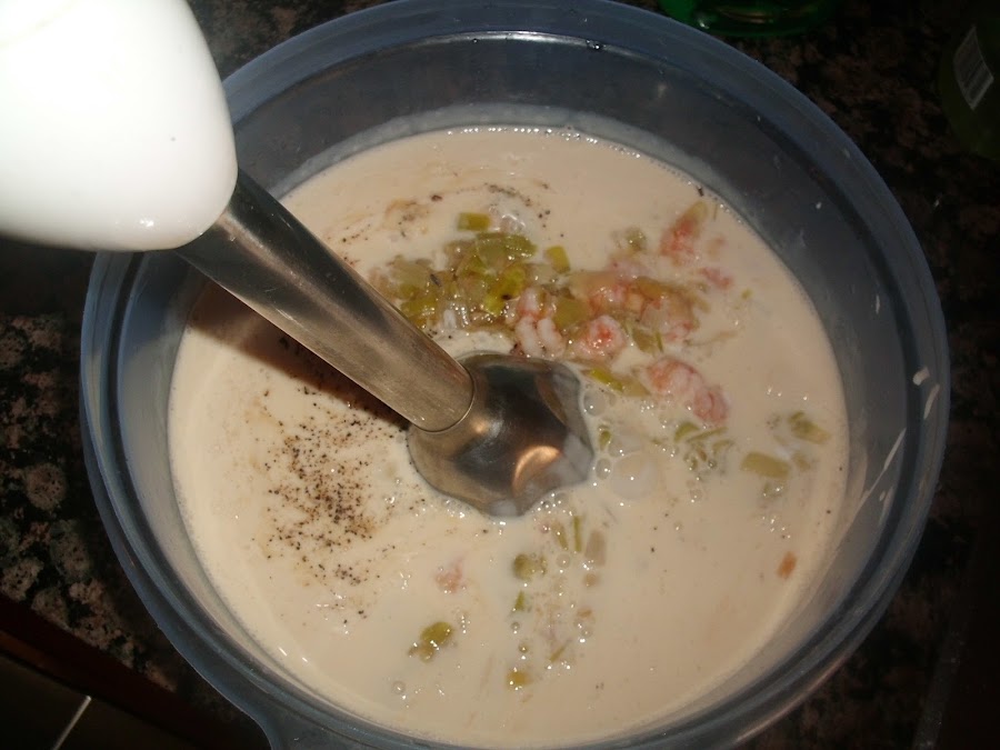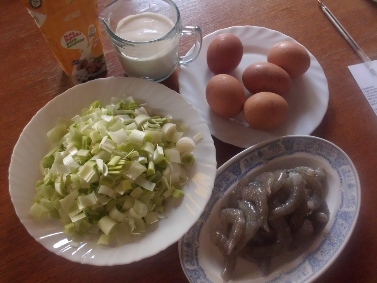 En un bol batimos los huevos con sal, añadir la nata (crema de leche) , la leche y la mezcla de puerros y gambas