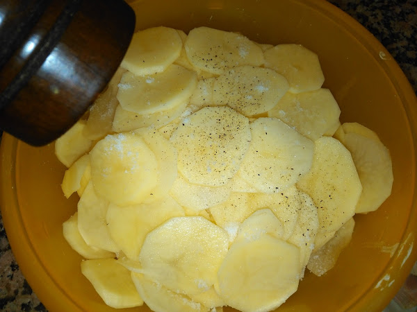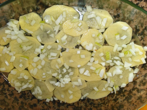 Salpimentamos las patatas, pintamos con aceite la fuente apta para el horno y ponemos una primera capa, a continuación la cebolla cruda