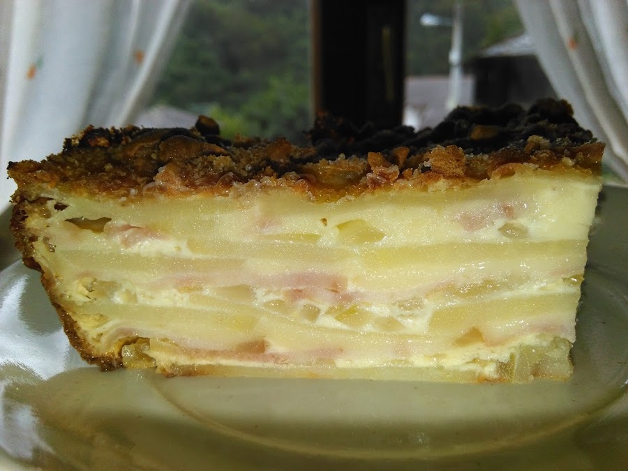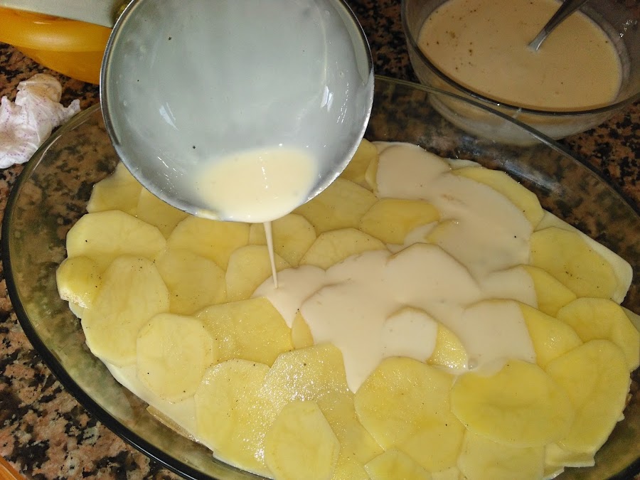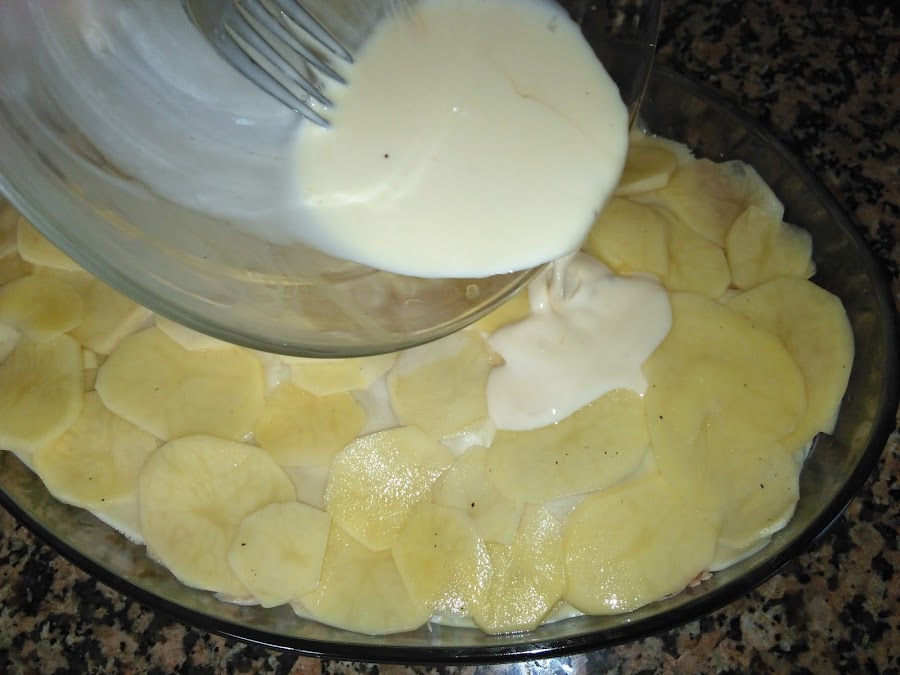 Después otra capa de patata y poemos un poco de la mezcla que tenemos reservada del huevo y la nata (crema de leche)