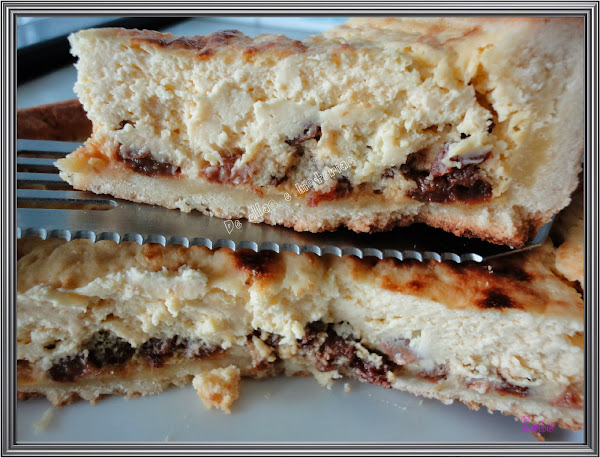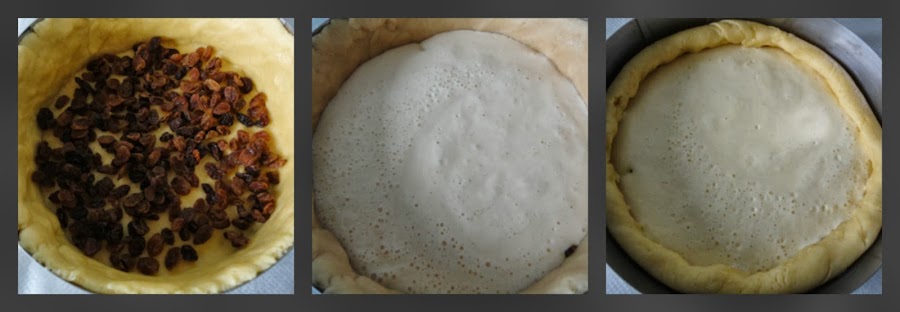 Pinchamos el fondo de la masa con la que hemos forrado el aro y colocamos encima las pasas. Extendemos sobre las pasas la crema que hemos preparado e introducimos al horno unos 55/60 minutos, a 180º y pasados 30 minutos bajamos la temperatura a 160º.