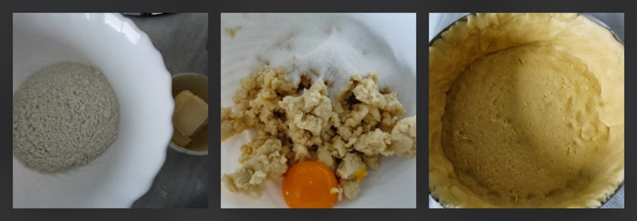 En un cuenco ponemos la harina con la sal. Añadimos la mantequilla y la deshacemos con las manos hasta que el conjunto parezca pan rallado. Añadimos el azúcar y la yema y, el agua suficiente para formar una masa consistente.