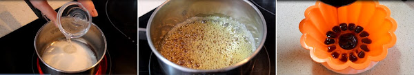 Primero hacemos el caramelo casero. Ponemos en un cazo al fuego el azúcar y el agua y dejamos que hierva hasta que tome un color dorado, no demasiado oscuro, porque si no amarga...