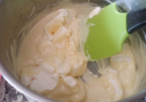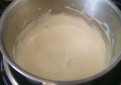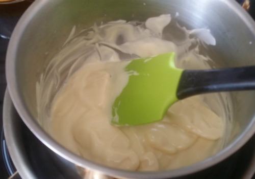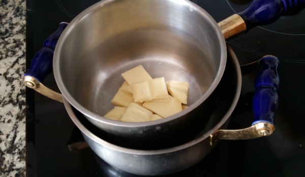 Derretir el chocolate blanco al baño maría.