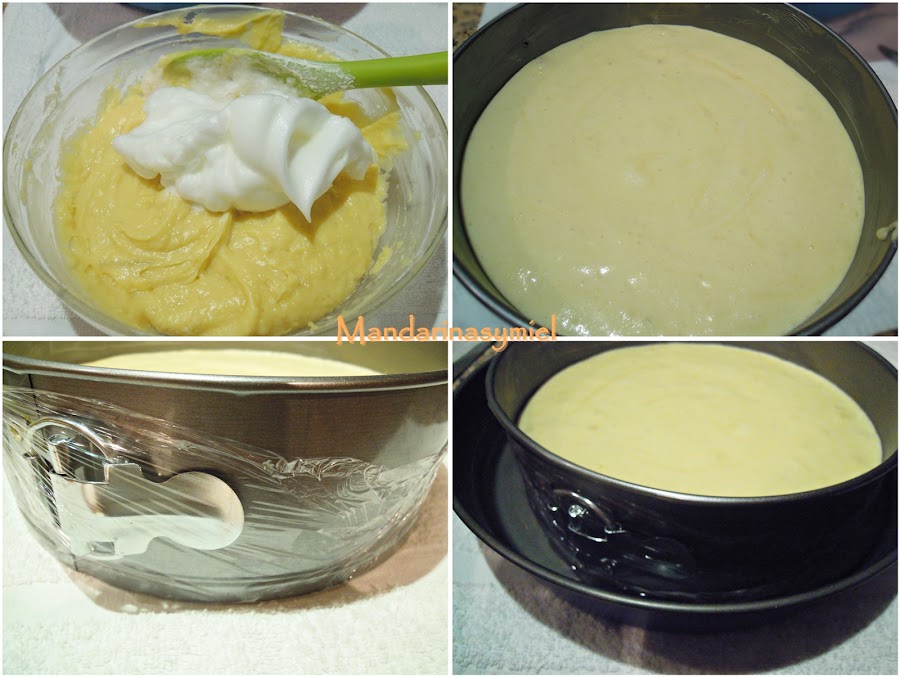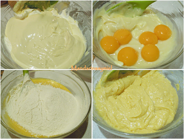Añade ahora las claras montadas a punto de nieve y mezcla poco a poco con movimientos envolventes, de abajo arriba, para que no se bajen las claras.