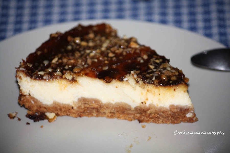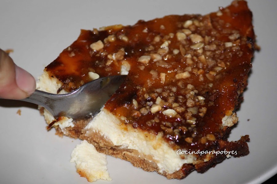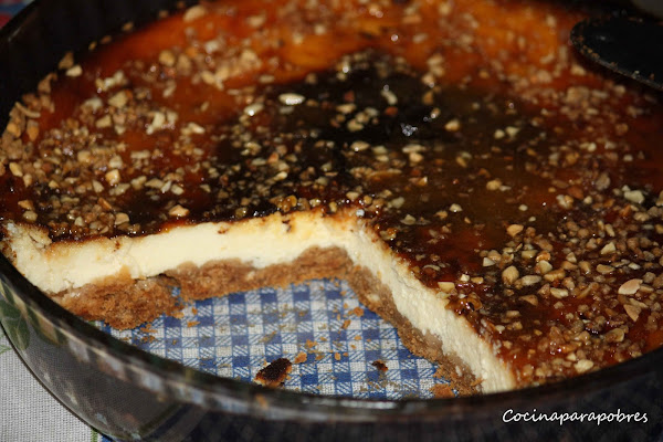 Batimos con la batidora los huevos, el queso y el resto de azúcar, vertemos la mezcla sobre la pasta del molde previamente horneada y dejamos 30 minutos mas en el horno.