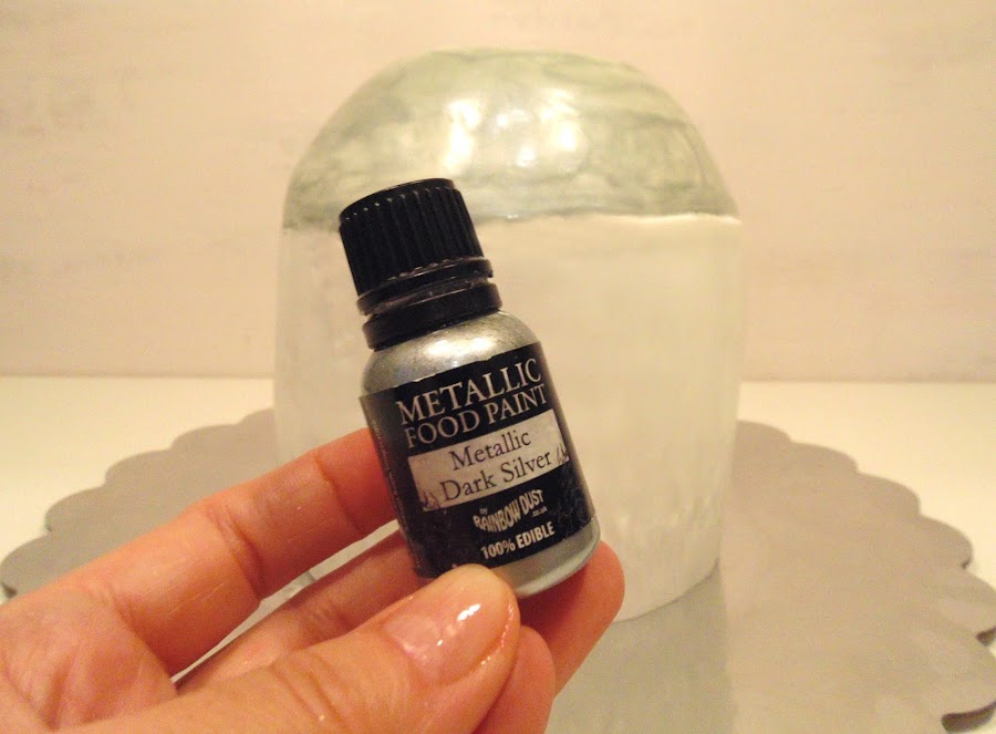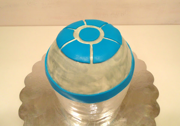 Cubrimos con fondant blanco tanto el cuerpo de R2D2 como las patas de chocolate. Luego pintamos la parte superior del cuerpo, lo que sería “la cabeza”, con pintura comestible metálica plateada. Dejamos secar y colocamos una tira de fondant de color azul celeste alrededor de la cabeza. Ahora podemos enganchar las patas. Para ello podemos utilizar pegamento alimentario o un poco del mismo glasé que utilizamos para decorar galletas.