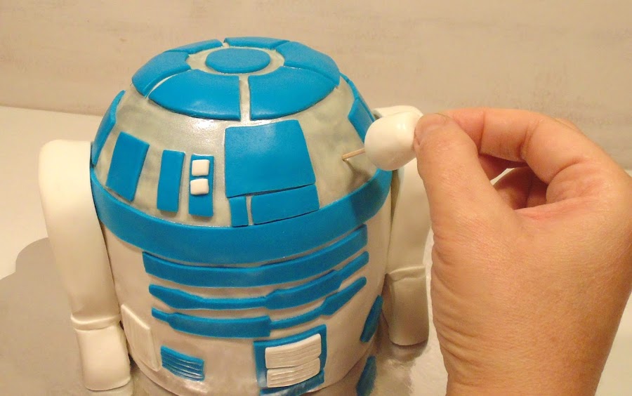 Añadimos un círculo del mismo azul en lo alto de la cabeza y 6 rombos a su alrededor. Todas estas piezas pueden pegarse igual que las patas. Y continuamos agregando rectángulos de diferentes tamaños hasta que R2D2 se empiece a parecer a sí mismo. Los de color plateado los haremos con fondant blanco y los pintaremos con la pintura comestible metálica plateada. Hay algunos puntos en rojo y un gran círculo negro en lo que a mí me parece “la frente” (seguro que algún friki me sabrá decir exactamente que representa). Finalmente las piezas que sobresalen más (no sé ni cómo definirlas, ¿ojos?) las sujetamos con palillos para asegurarnos que no caigan.