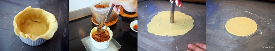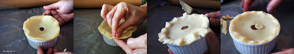 Colocar la tapa encima del molde y, presionando con los dedos los dos discos de masa (ver detalle en la foto), ir creando puntos de cierre uno al alado de otro hasta completar el círculo. Retirar la masa sobrante con un cuchillo.