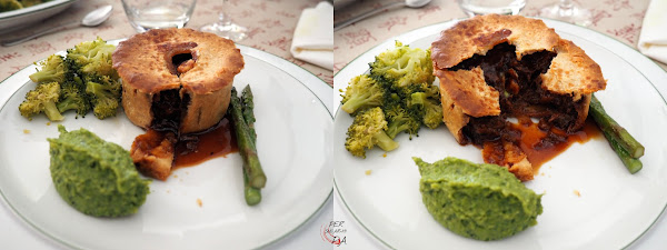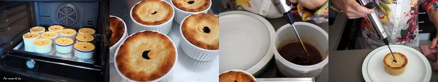 Truco genial de Heston: calentar un poco la salsa que hemos reservado, llenar una jeringa de cocina e ir inyectándola, a través de la chimeneas, en el interior de los pasteles. Al abrirlos en la mesa hace un efecto parecido a un coulant y añade jugosidad al relleno.