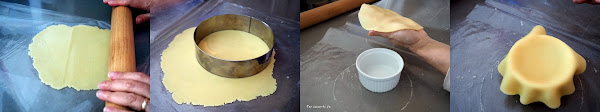 Con un aro, o plato o similar, marcar y cortar un círculo de diámetro suficiente para cubrir el interior de los moldes que vayamos a utilizar. Colocar la masa centrada y, con cuidado ir introduciéndola en el molde, forrando bien todo el interior.