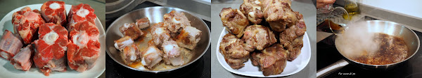 En una olla o sartén al fuego calentar tres o cuatro cucharadas de aceite de oliva. Salpimentar y sellar las piezas de rabo de buey por todos los lados. Si tenéis mucha carne hacerlo en tandas, la carne siempre tiene que estar en contacto con el fondo, no amontonada. Cuando empiecen a tomar color retirar y reservar.
