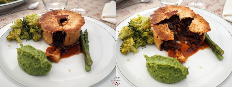 Solo queda emplatarlos. Como guarnición hemos elegido verduras al vapor (brócoli) y puntas de espárragos salteadas, y para darle un punto de frescor y contraste al guiso de carne, un puré de guisantes con menta fresca (podéis ver la receta haciendo clic aquí), que ha sido un acierto.