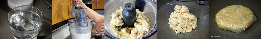 Tener preparado un vaso con agua fría (un cubito de hielo ayudará a mantener la temperatura). Con la máquina en marcha, ir añadiendo el agua cucharada a cucharada, hasta que la masa ligue en una textura grumosa.