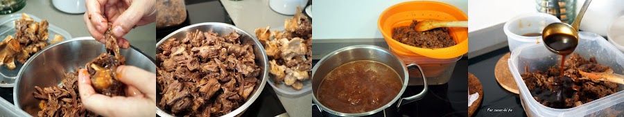 Separar la carne del hueso y desmenuzar en pequeñas hebras, de manera que quede limpia de todo lo que no sea comestible y esté lista para el relleno.