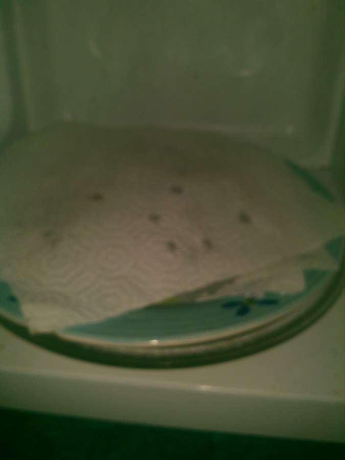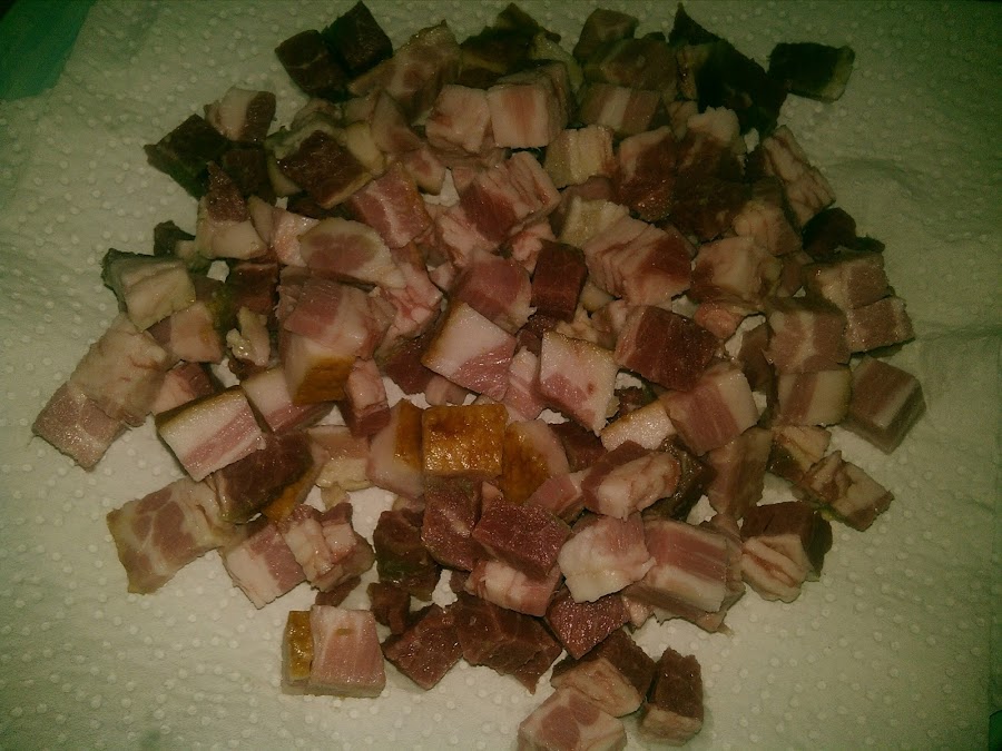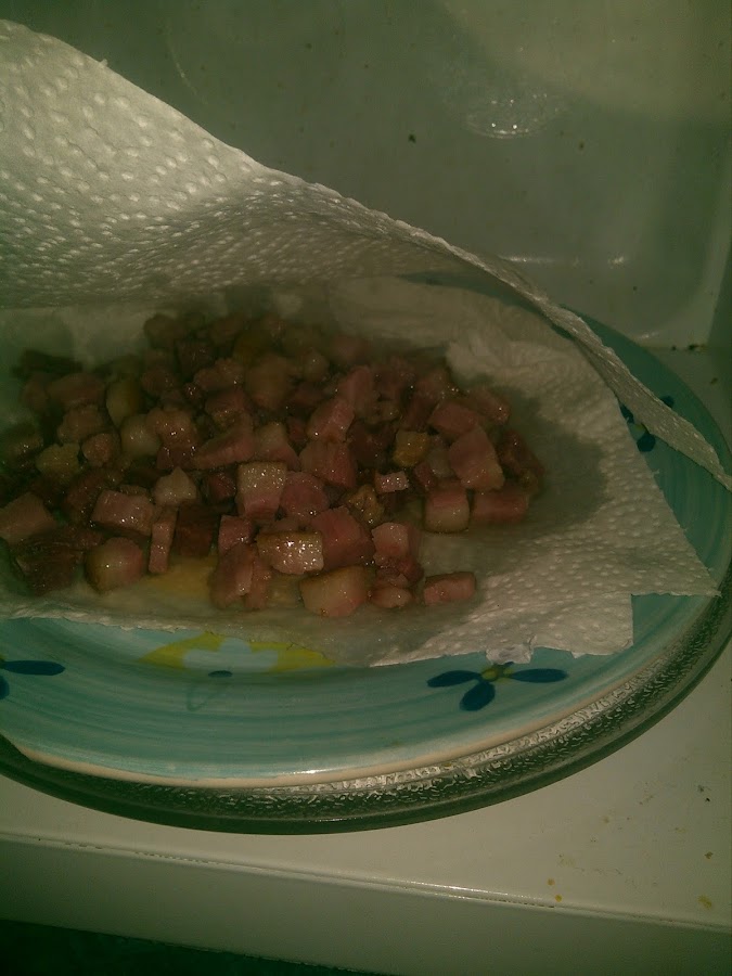 Cortar el tocino en cuadritos y poner sobre papel absorbente y llevar al horno microondas por un par de minutos, yo cambie el papel absorbente un par de veces para evitar el exceso de aceite.