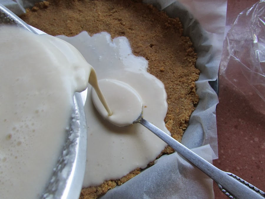 Ponemos el requesón, la nata (crema de leche), la leche, el azúcar y los huevos en un recipiente y lo batimos con la batidora unos segundos, hasta tener una mezcla homogénea. Vertemos sobre la base con cuidado de no hacer huecos. Nos podemos ayudar con una cuchara, vertiendo sobre esta para que el impacto sea mínimo.