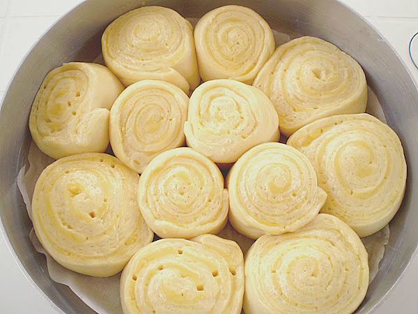 Coloca cada rosa en un molde enmantequillado de 26-28 cm de diámetro bien espaciadas entre sí. También puedes usar dos bandejas más pequeñas. Deja que las "rosas" vuelvan a crecer durante otra hora, lo mejor es colocar la bandeja en el horno. (con el horno apagado jejeje!)
