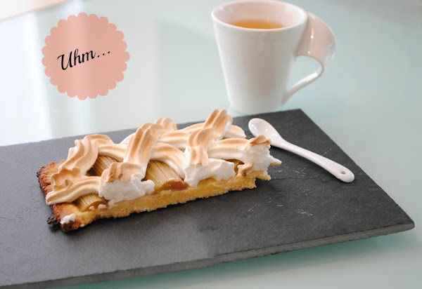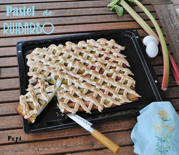 Sobre una superficie enharinada extender la masa del tamaño de la bandeja del horno. Hacer un rollo flojo con la lámina de masa, poner sobre la bandeja del horno y desenrollarla. Pincharla varias veces con un tenedor. Poner uno junto a otro los trozos de ruibarbo sobre la masa. Cocer el pastel 30 minutos a altura media.