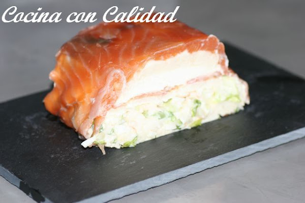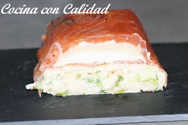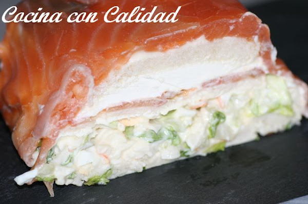 Colocamos una capa sobre el queso de untar. A continuación ponemos otra capa de pan de molde y lo impregnamos nuevamente con nata (crema de leche). Añadimos la mezcla de lechuga, palitos de cangrejo, cebolleta, huevos cocidos y mayonesa. Tapamos con una nueva capa de pan de molde, sobre la que terminaremos de echar la nata (crema de leche) líquida. Cerramos con lo el salmón y ponemos peso encima. Metemos al frigo. Está mejor de un día para otro. Al día siguiente desmoldamos dándole la vuelta y listo para comer. Riquísimo.