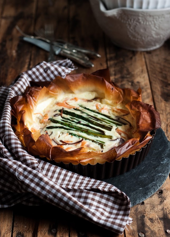 En esta ocasión os enseño una especie de quiche, que no me maten los expertos en cocina, que en lugar de masa quebrada se hace con pasta filo, me encanta ese crujiente y la forma tan bonita que le da a cualquier pastel. ¡Es muy fácil porque simplemente consiste en pintar las hojas con mantequilla y colocarlas una sobre otra asentándolas sobre el molde, que no os asuste!