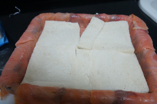 Iremos poniendo una capa de pan de molde sobre el salmón, dejando todo cubierto.