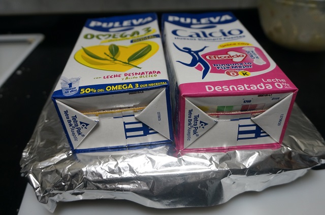 Lo taparemos bien, pondremos unos pesos encima para presionar y que quede bien el pastel. Yo puse unos cartones de leche.