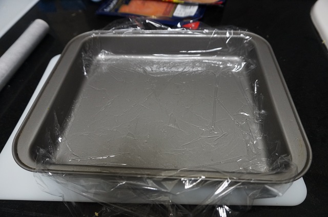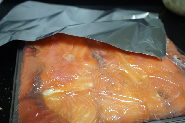Lo dejaremos todo bien cubierto de salmón. Lo taparemos con el film transparente y luego lo cubriremos con papel de plata.