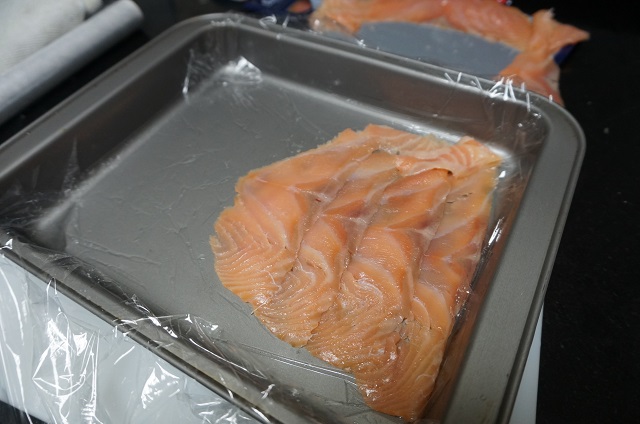 Iremos poniendo láminas de salmón, empezaremos por el centro.