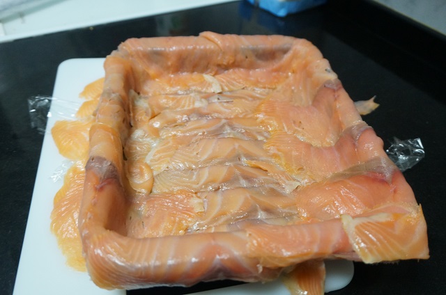 Pondremos en el centro una fila de salmón y terminaremos con las lonchas que sobresalen de los lados, tapando todo el pastel.