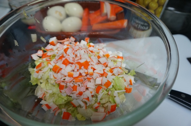 Picamos los huevos y las aceitunas, todo pequeño lo echamos al bol junto a la lechuga y el surimi.