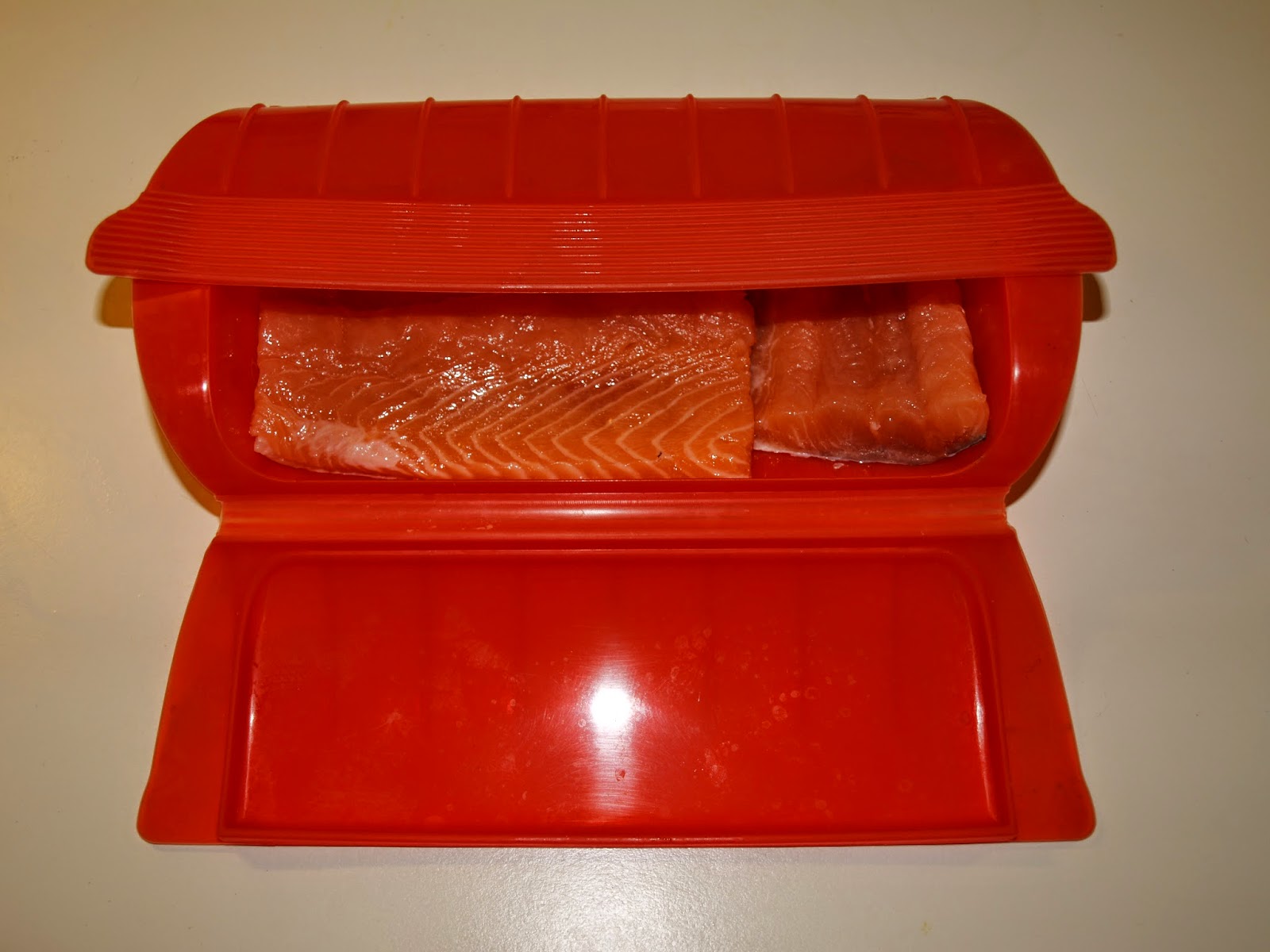 - Lo primero que haremos, si no lo tenemos preparado ya, es cocinar el salmón. Yo lo hice en el microondas, en un estuche de vapor. Se tarda solo unos minutos y queda muy jugoso. Os recomiendo que no hagáis demasiado, ya que luego en el horno se terminará de hacer. Que quede jugosito. Lo dejamos enfriar y lo desmenuzamos con las manos. Reservamos.