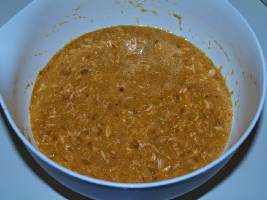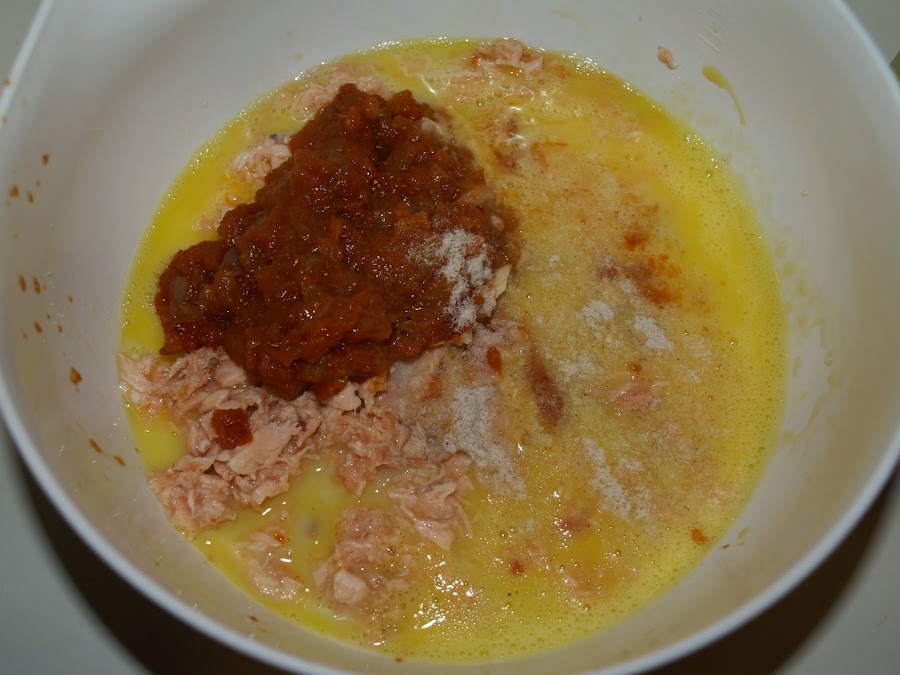 - Añadimos el salmón desmenuzado, la leche y el sofrito y mezclamos bien.