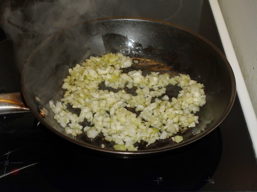 - A continuación, calentamos un poco de aceite en una sartén y pochamos la cebolla, previamente picada.