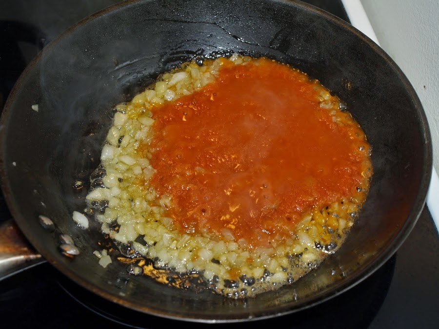 - Cuando la cebolla tenga un tono dorado, añadimos el tomate y dejamos hervir unos minutos a fuego no muy fuerte. Apagamos y reservamos.