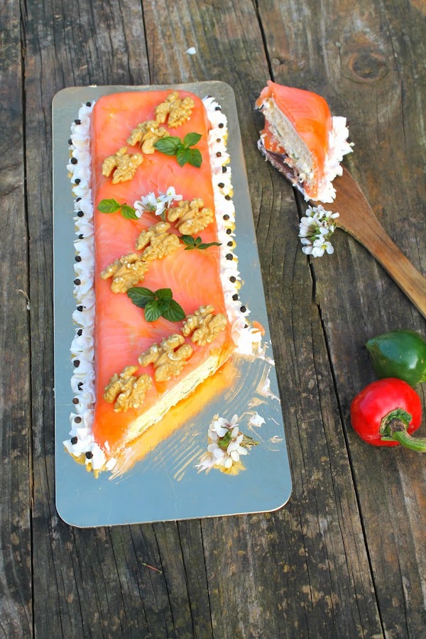 Empezamos forrando el molde deseado con papel film dejando parte del papel colgando por fuera del molde. En mi caso he usado un molde de aluminio para bizcochos, en concreto el que use en el Bizcocho de yogur y limón. Una vez tenemos el papel transparente colocado vamos colocando las lonchas de salmón ahumado intentando juntarlas para que quede una película uniforme. A continuación colocamos una fina capa de queso crema y por encima una capa de galletas saladas. Volvemos a cubrir las galletas con queso y esta vez espolvoreamos las nueces picadas y volvemos a tapar con galleta. Damos una última capa de queso y colocamos los pepinillos cortados en lonchas finas por toda la superficie, apretamos y colocamos una tercera y última capa de galletas. Cubrimos con salmón ahumado y tapamos con el papel film sobrante. Apretamos bien y refrigeramos antes de desmoldar. Para servir abrimos el papel film, le damos la vuelta al pastel en la bandeja que vamos a usar y retiramos el resto de papel film. Yo he decorado con queso crema, granos de pimienta y medias de nueces crudas.