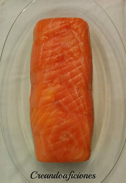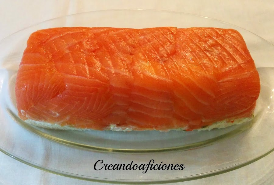 Forramos el interior del molde con salmón, encima del papel film.