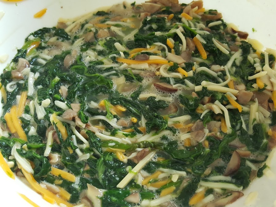 7. - Le añadimos las setas picadas, las espinacas y el queso y mezclamos todo.