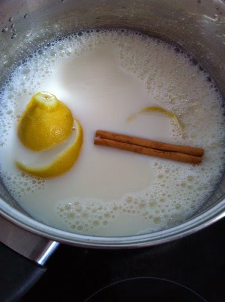 Empezaremos poniendo a cocer en una cazuela los 3 vasos e leche junto con la rama de canela y la peladura de uno de los limones, todo ello a fuego fuerte.