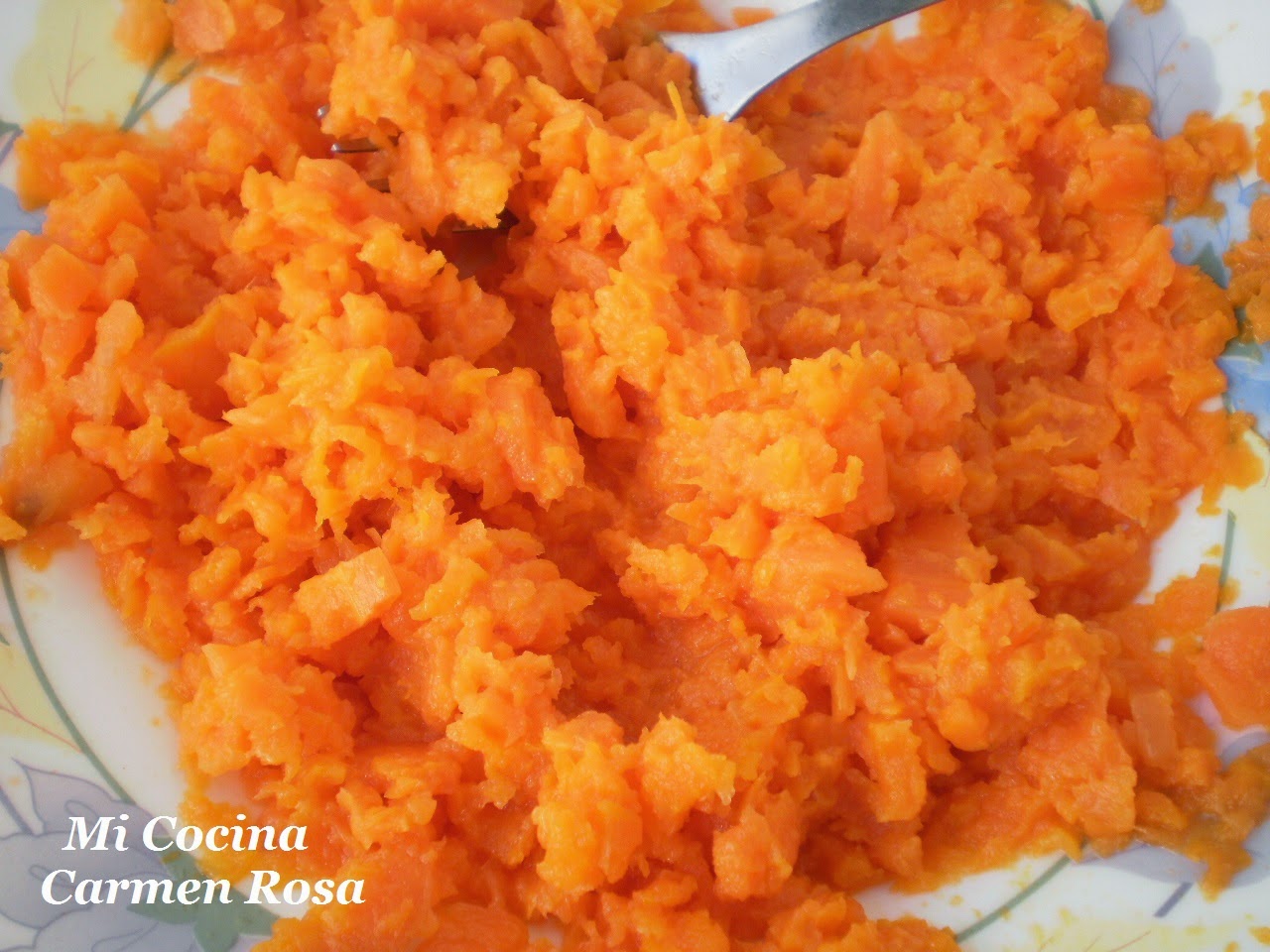 Cortar las patatas y la calabaza en trozos y cocerlas en agua con un poco de sal por separado hasta que estén tiernas. Reservarlas calientes sin tirar el agua de cocer, tanto las de las calabazas como las de patatas.
