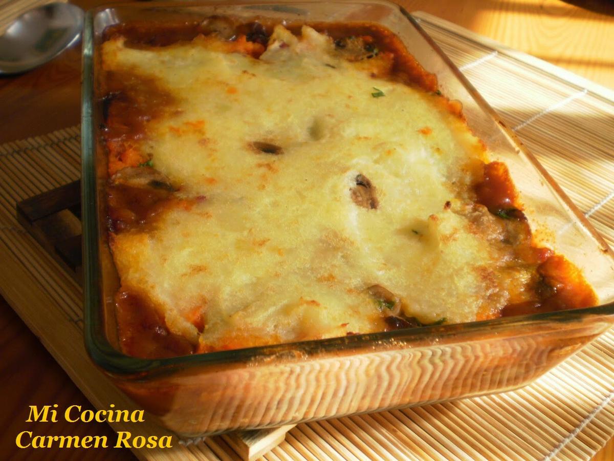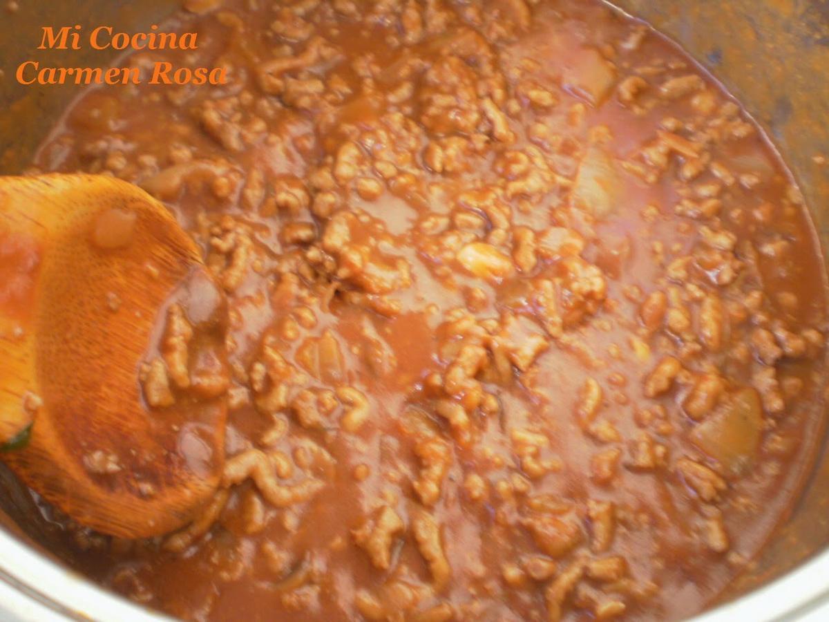 Medio kilo de carne picada de ternera, una cebolla, tres dientes de ajo, medio vaso de aceite de oliva virgen extra, dos cucharadas soperas de salsa Worcestershire, también conocida como salsa worcester o salsa inglesa o simplemente salsa perrins (se pueden encontrar en cualquier supermercado), un vaso de vino tinto, una cucharada sopera de Maicena, dos tomates rallados (sin piel), 150 grs. de champiñones laminados, 75 grs. de jamón serrano cortado en taquitos (ya se pueden encontrar cortados en los supermercados), una ramita de perejil fresco y sal.