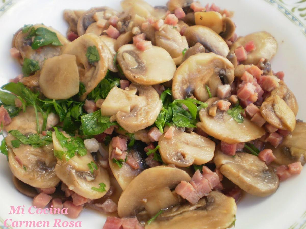 En una sartén con tres o cuatro cucharadas de aceite de oliva pochar dos ajos picados muy finamente, con cuidado de que no se quemen (amargarían) incorporando los champiñones, dándoles vueltas para que se doren por todos lados igual.