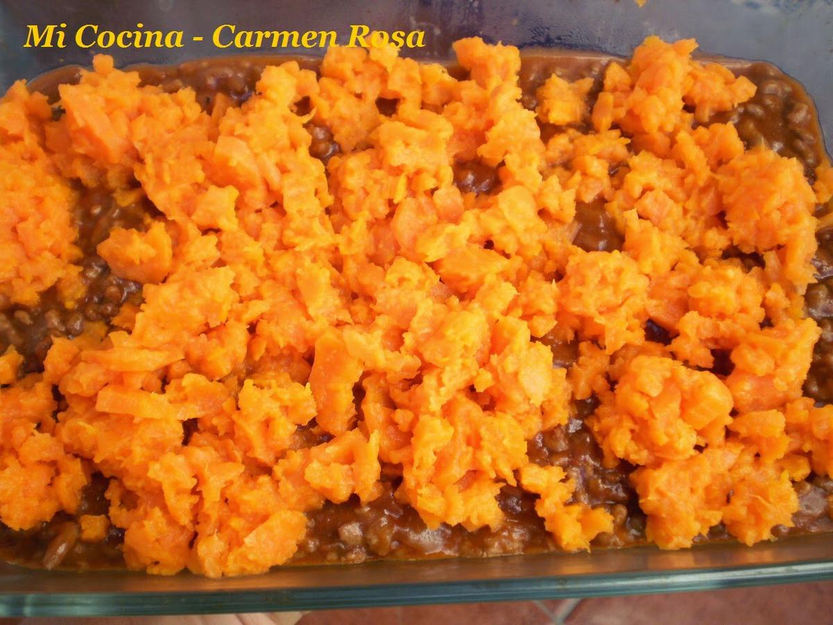 En una fuente de cristal especial para hornear echar la salsa de carne y a continuación el puré de calabaza.