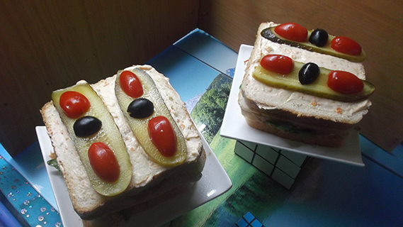 Decoramos esta rebanada con las lonchas de pepinillo en vinagre, los tomates cherrys partidos en dos y la aceituna.