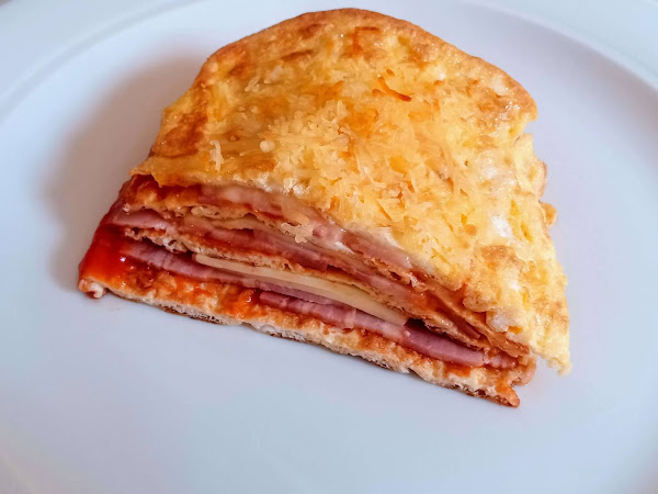 Ponemos a calentar el grill del horno. En una fuente ponemos una capa de tortilla, un par de cucharadas de salsa de tomate, una loncha de queso y dos de bacon. Colocamos otra tortilla y repetimos haciendo capas.