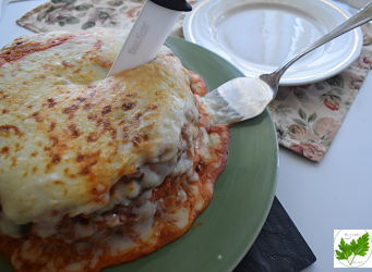 En un plato grande o bandeja apta para horno, coloca las tortillas una encima de otra. Ponla como más te guste y según colores, al cortarla quedará más bonita. Pon unas cucharadas de tomate frito sobre ellas. A continuación cubre con la bechamel de cobertura y espolvorea con el queso rallado.
