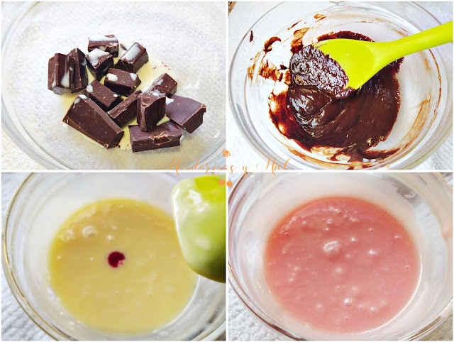 Funde los chocolates por separado en el microondas o al baño María con un chorrito de leche.