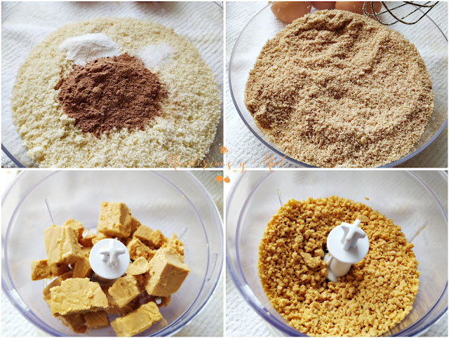 Tritura o pica la pastilla de turrón, no la tritures demasiado para que no suelte aceite, además es mejor que se note algún que otro trocito de turrón.