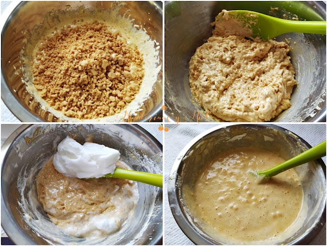 Incorpora una cucharada de las claras montadas a la mezcla, ten cuidado de que no se bajen, cuando esté bien unido añade otra cucharada y mezcla, hazlo así hasta que hayas unido todas las claras montadas a la crema. Ahora la masa ya es suave y esponjosa.