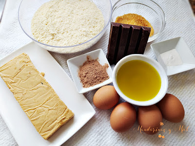 Es un pastel que está hecho sin harina ni leche, pero con una espectacular combinación de ingredientes, ya que lleva almendra molida, una pastilla de turrón de Jijona que me sobró de estas navidades y chocolate de dos colores para el adorno....a que te apetece???