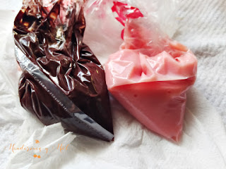 Después he he hecho lo mismo con el chocolate rosa. Como verás en las fotos, al principio estaba demasiado líquido y se corría al ponerlo en el pastel, así que he metido la bolsita en la nevera 5 minutos y luego he seguido haciendo las rayitas.